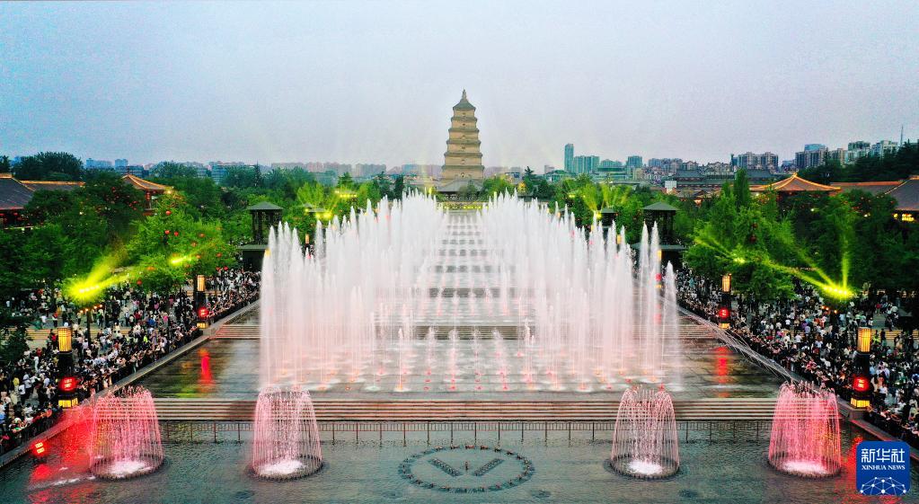 陜西西安大雁塔北廣場(chǎng)音樂(lè)噴泉是西安旅游打卡地之一,每天會(huì)進(jìn)行四場(chǎng)演出,吸引市民和游客前來(lái)觀看。