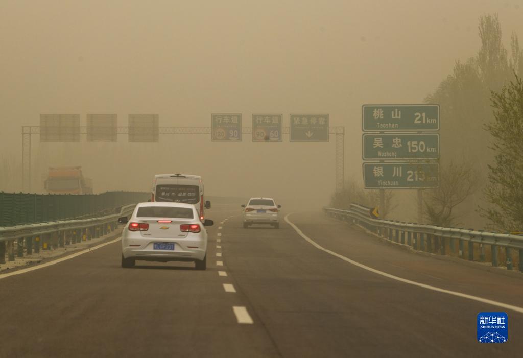 4月19日,車輛冒著沙塵天氣在福銀高速同心段行駛。