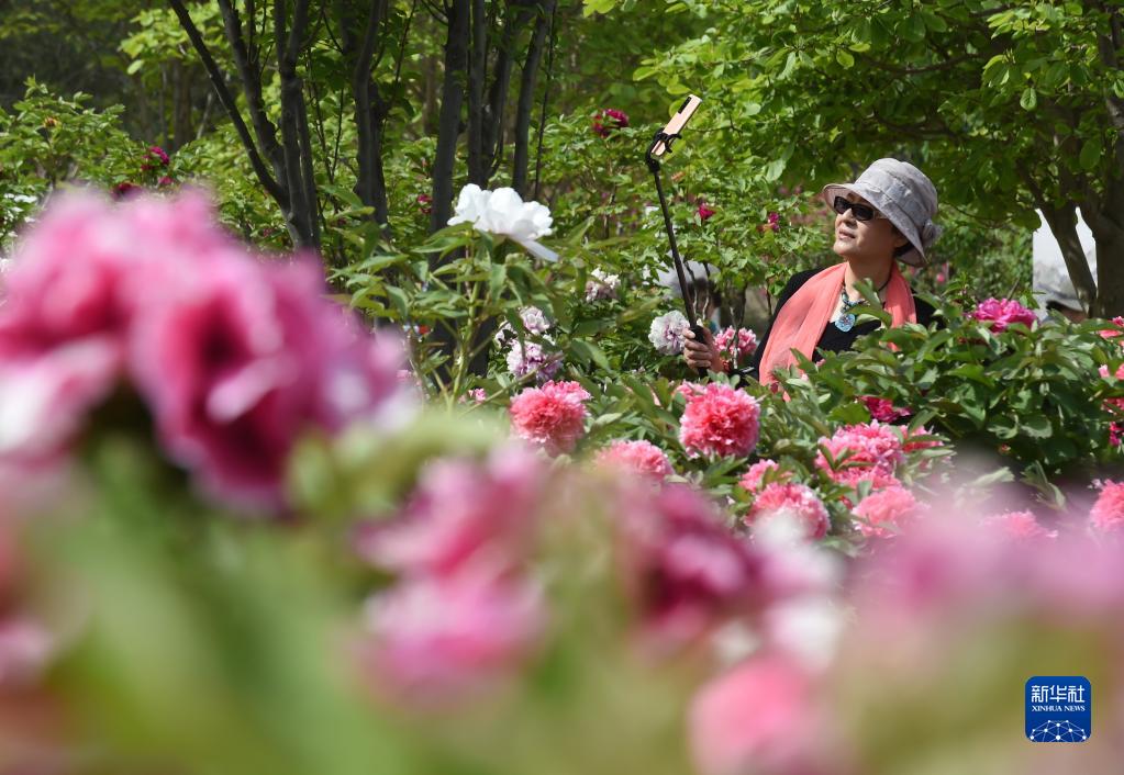 4月19日,游客在北京圓明園內的牡丹花前自拍。