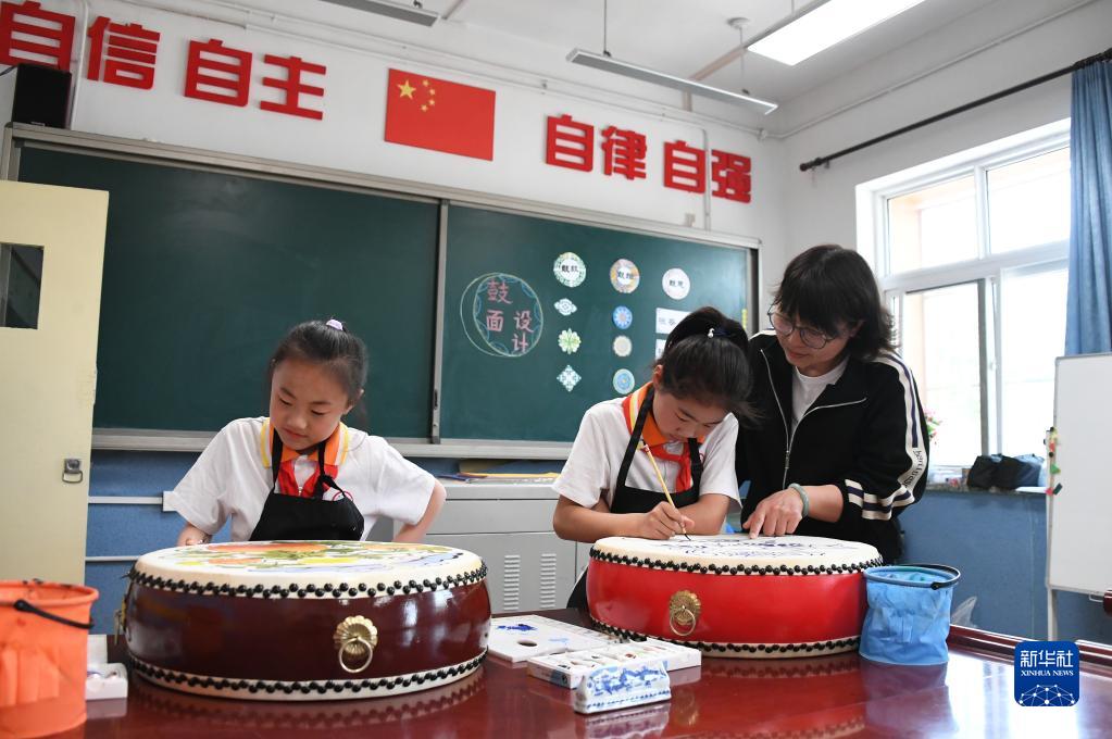 4月19日,在門樓中心小學,教師在美育課上指導學生繪制鼓面。