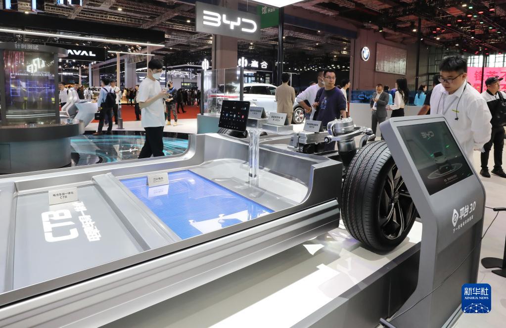 4月19日,參觀者在比亞迪汽車展臺觀看CTB電池車身一體化展示平臺。