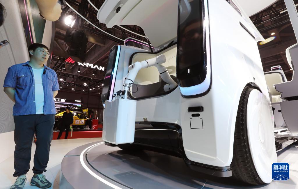 4月18日,參觀者在滴滴自動駕駛展臺體驗一款無人概念車的機器人搬運行李功能。