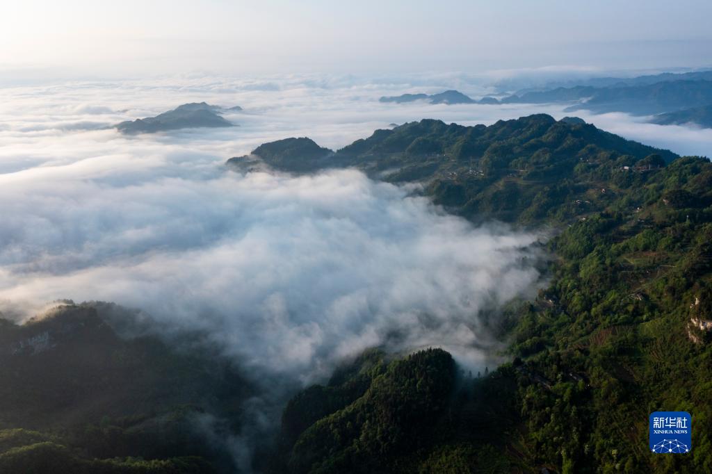 當日,位于重慶市南川區的世界自然遺產地金佛山雨后放晴,山間升騰起的水汽匯聚成云海在山巒之間流淌,美不勝收。