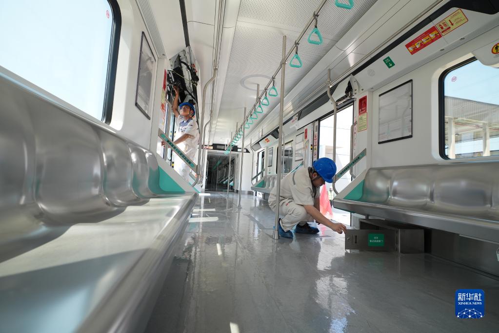 4月19日,在重慶市軌道交通18號線金鰲寺車輛段,工作人員在對裝配下線的電客車進行檢查。