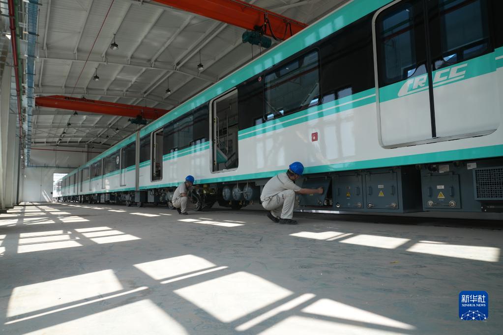 4月19日,在重慶市軌道交通18號線金鰲寺車輛段,工作人員在對裝配下線的電客車進行檢查。