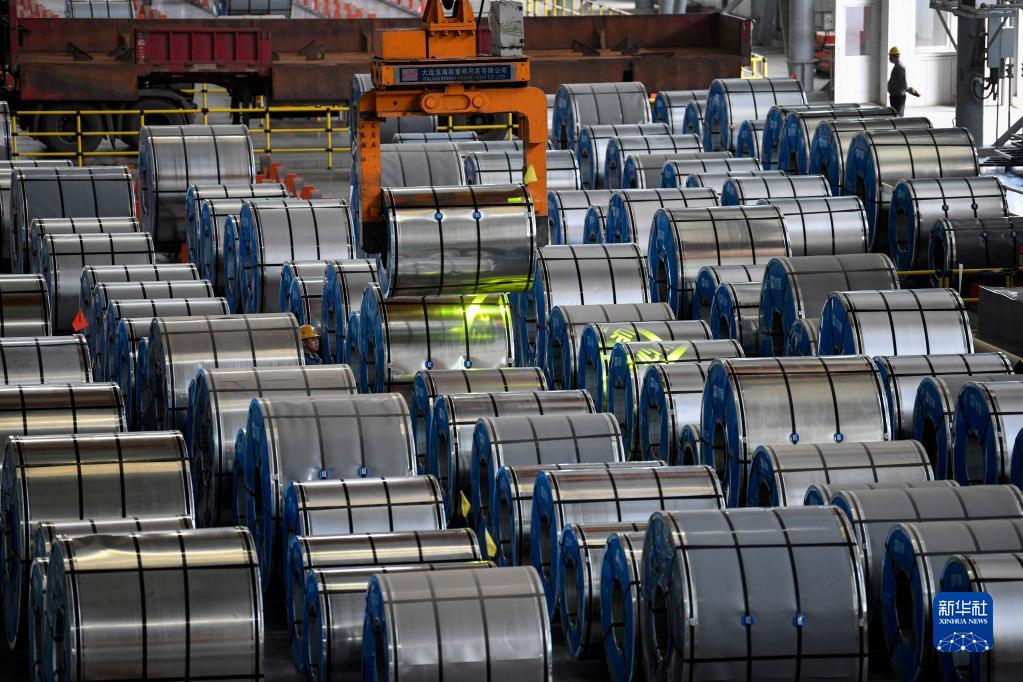 4月19日,在河北雙灤一家釩鈦新材料企業冷軋產品車間,工人在吊裝冷軋鍍鋅板。