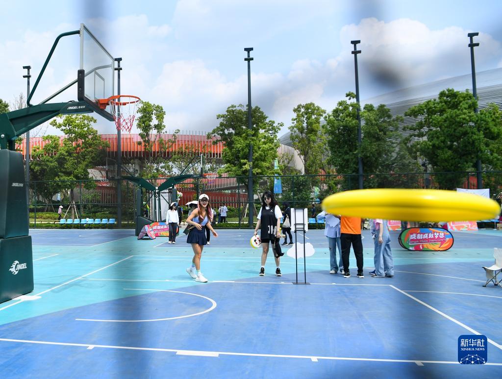 4月19日,在成都東安湖體育公園,體育愛好者在 “潮流運動會”上體驗飛盤。