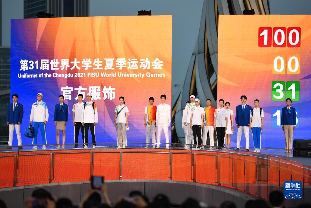 4月19日,在成都大運會倒計時100天啟動儀式上,模特展示成都大運會官方服飾。