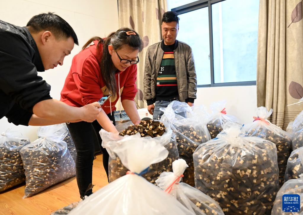 4月19日,屏南縣電商創業者楊晨芬(中)在嶺下鄉橫坑村羊肚菌菇種植戶魏供嶺(右一)家里收購。