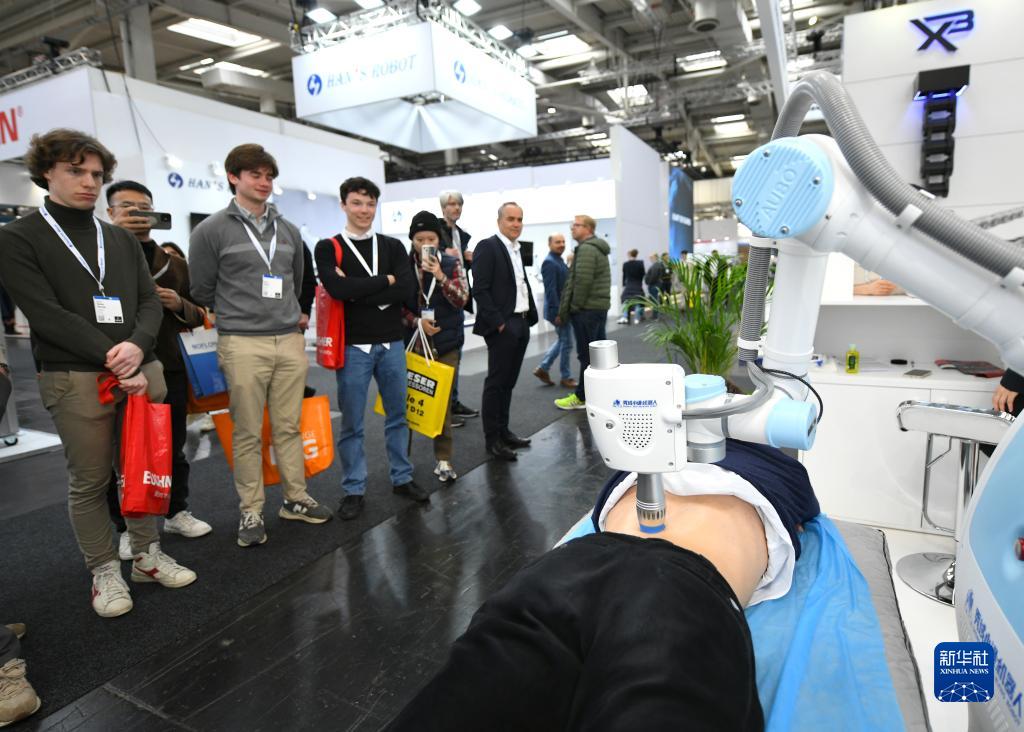 4月18日,在德國漢諾威工博會上,遨博協(xié)作機(jī)器人為一名男子理療。