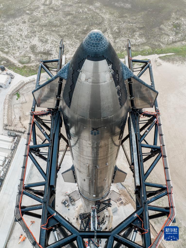 這張4月11日公布的圖片顯示,美國太空探索技術公司的新一代重型運載火箭“星舟”以及飛船集成系統(tǒng)在位于得克薩斯州的一處發(fā)射基地等待升空。
