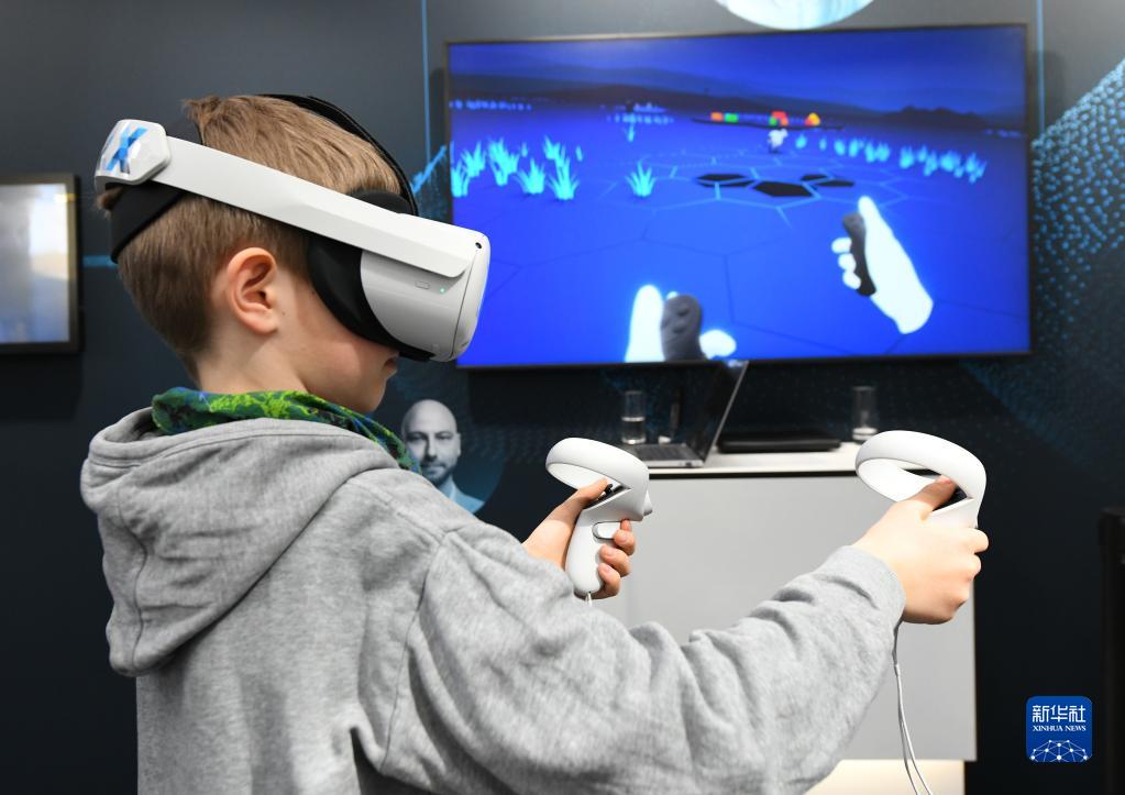 4月20日,小朋友在德國漢諾威工博會上體驗VR游戲。