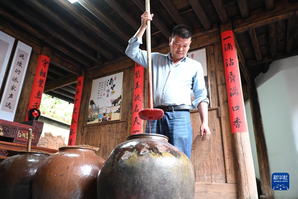 4月20日,村民吳善弟在屏南縣代溪鎮(zhèn)北墘村的黃酒技藝體驗館里展示釀酒過程。