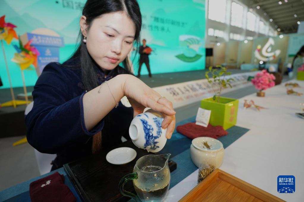 4月21日,在北京茶博會“春茶臨京城 共品非遺茶”活動上,茶藝師在倒茶。