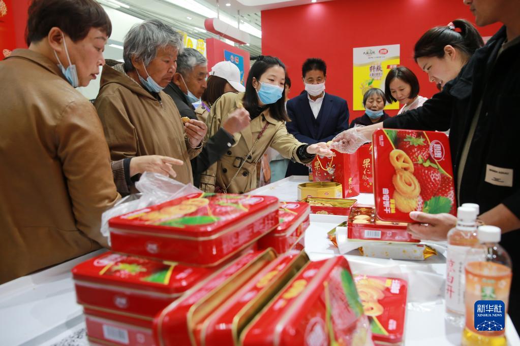 4月21日,在淮北市相山經濟開發區食品博覽園會展中心,觀眾在食品工業博覽會上品嘗食品。