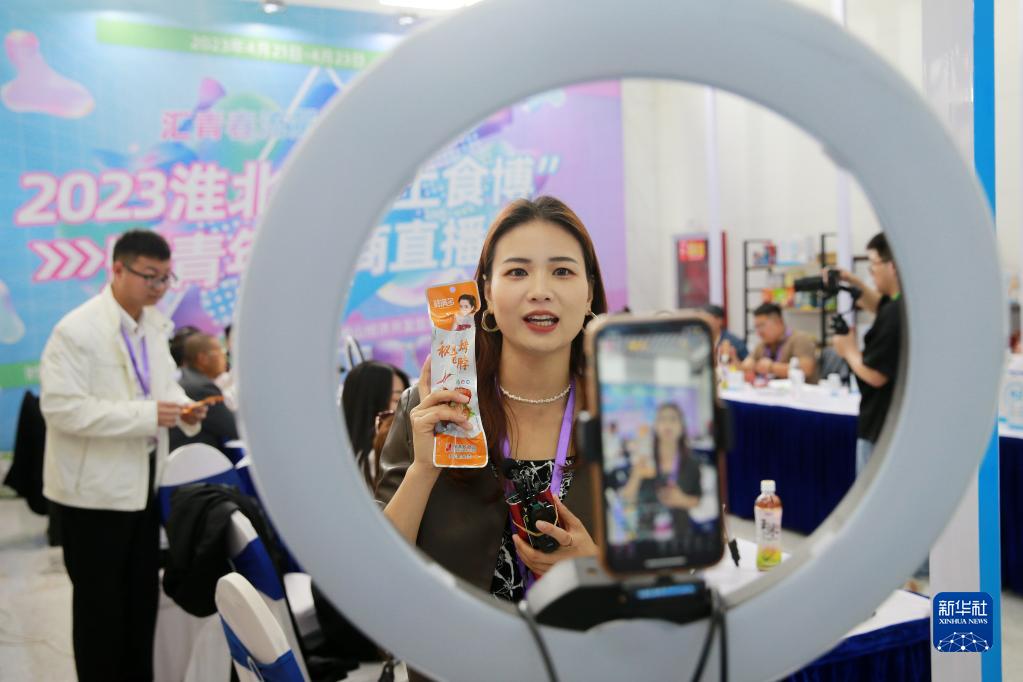 4月21日,在淮北市相山經(jīng)濟(jì)開發(fā)區(qū)食品博覽園會(huì)展中心,參展商工作人員通過直播推銷食品。