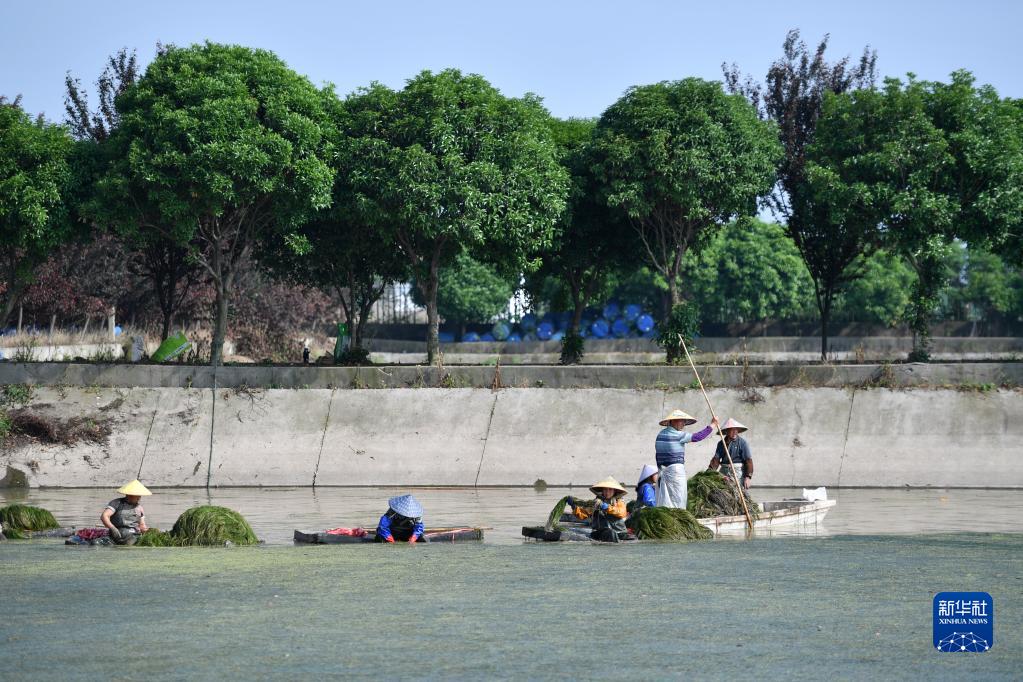 4月20日,工人在大通湖水生植物產業示范園內采收水草。
