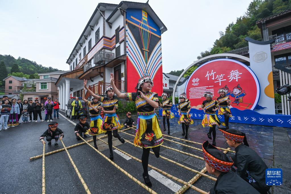 4月22日,孩子們身著畬族傳統服飾在團結村的“三月三”旅游文化周上表演竹竿舞。