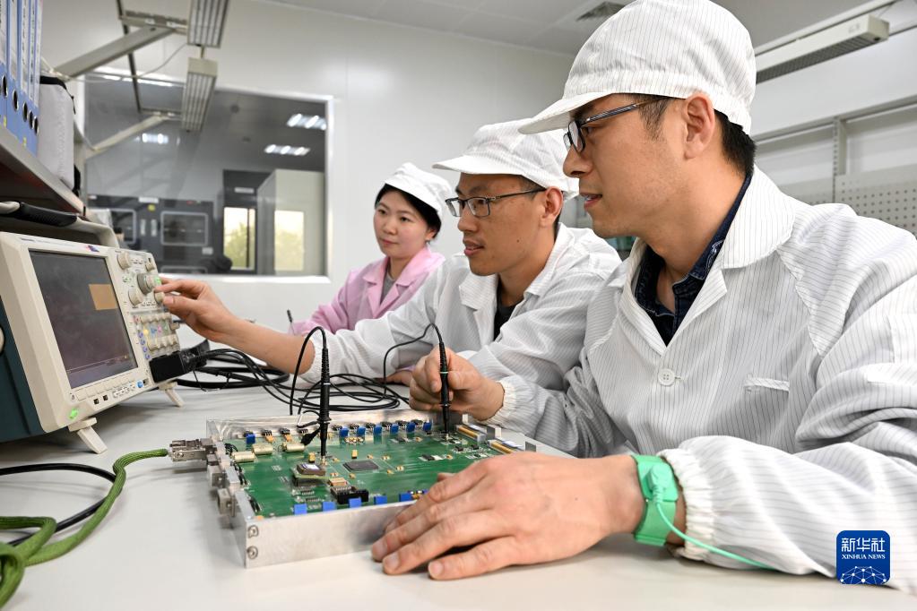 4月18日,在中科院合肥物質(zhì)科學(xué)研究院,安徽光學(xué)精密機(jī)械研究所環(huán)境光學(xué)研究中心成像光譜技術(shù)研究室副主任趙欣(前)和同事常振(中)、張露在測試CCD成像電路性能。