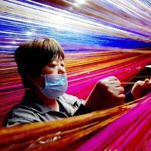 4月22日,在惠民縣桑落墅鎮“惠民工坊”,工作人員在針織機前修剪線頭。