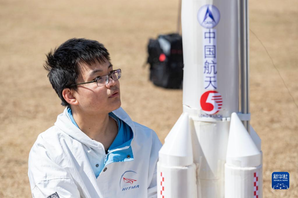 4月22日,在哈爾濱工業大學體育場,航模協會的學生在航模點火發射前進行調試。