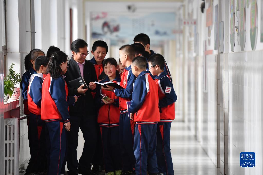 朱彥軍在靜寧縣城關(guān)小學(xué)和孩子們交流閱讀心得(4月10日攝)。新華社記者 陳斌 攝