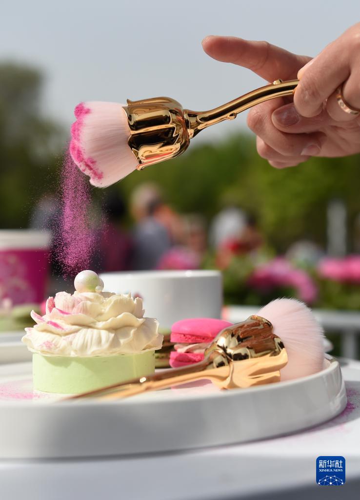 4月19日,工作人員展示圓明園推出的以牡丹花為主題的甜品,游客可以自己動手,將粉紅色的果粉撒在牡丹花造型的甜品上。
