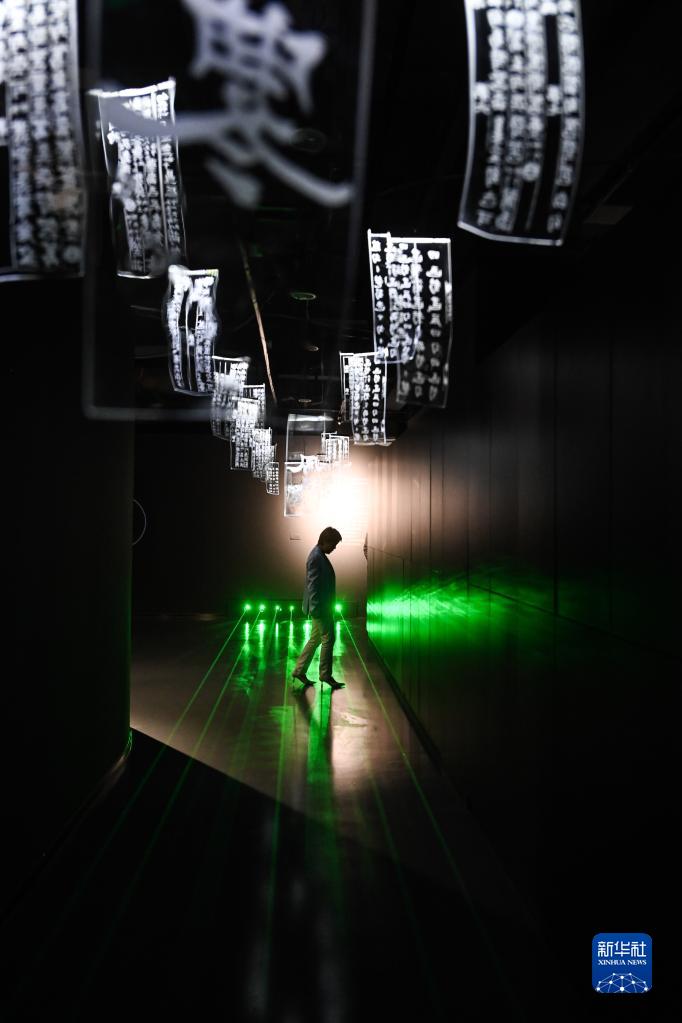 4月21日,一名讀者在嘉興市圖書館元宇宙閱讀體驗館內(nèi)通過觸碰不同光線來感受音律的變化。
