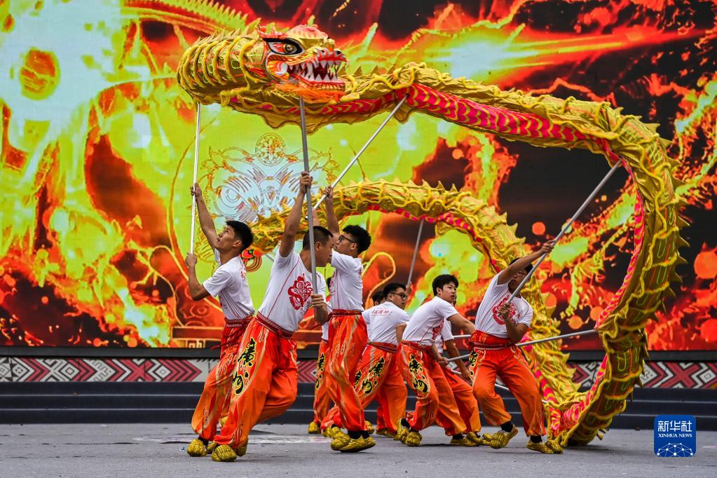 4月22日,在中國—東盟(南寧)非物質文化遺產周開幕現場,演員在表演舞龍。