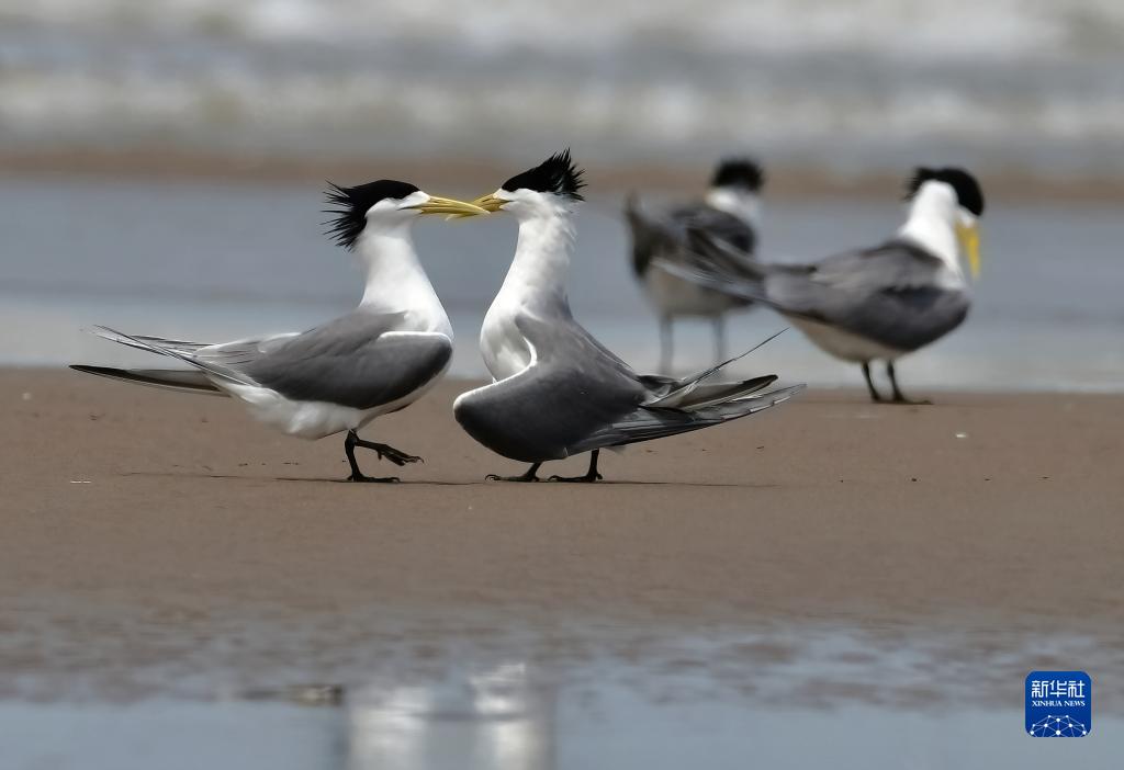 4月22日,國家二級保護野生動物大鳳頭燕鷗在閩江河口濕地沙灘上嬉戲。