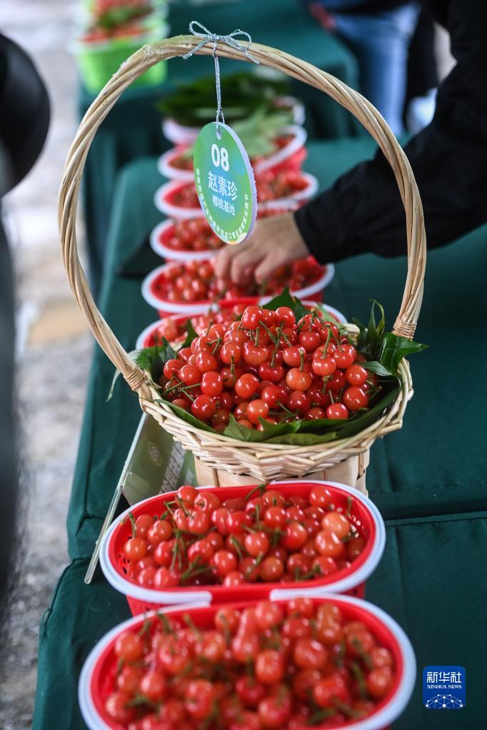 4月23日在櫻桃采摘節(jié)活動(dòng)現(xiàn)場拍攝的展銷的櫻桃。