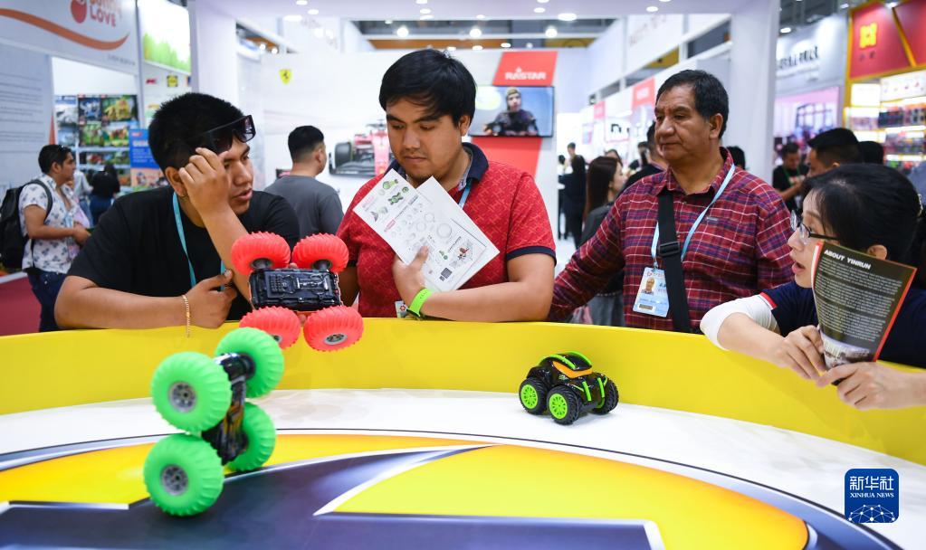 4月23日,采購商和參展商在遙控車玩具展區(qū)洽談。