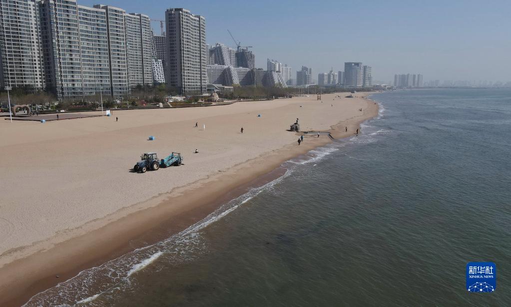 4月23日,工人在秦皇島市海港區金夢海灣浴場使用機械設備過濾海灘上的沙子(無人機照片)。