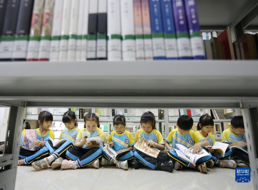 4月21日,小朋友在廣東省鶴山市桃源鎮新圩社區農家書屋閱讀。