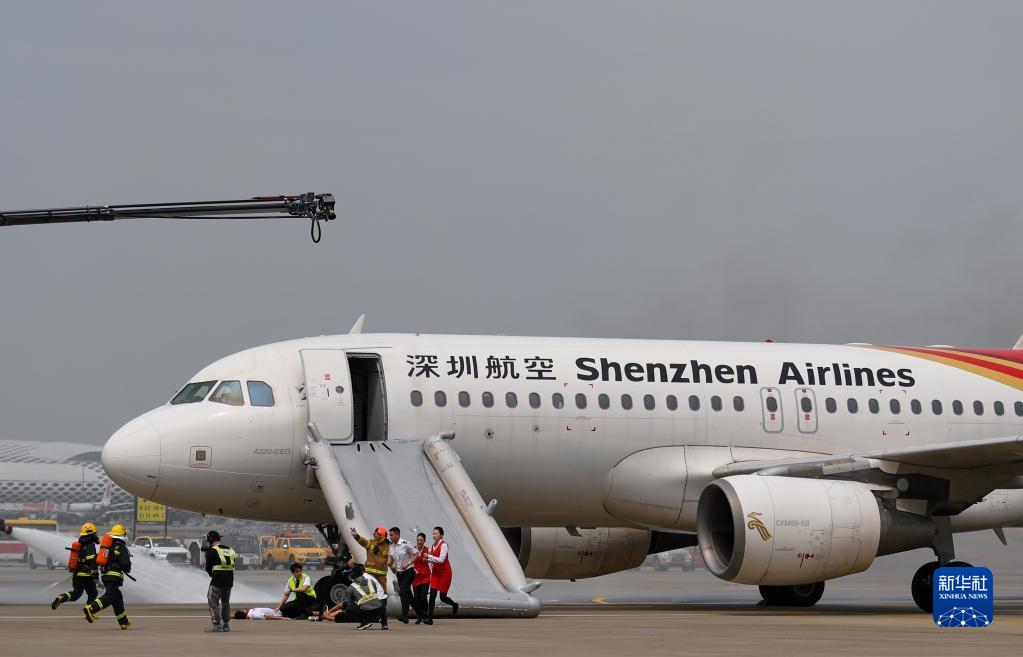 4月23日,在深圳機(jī)場(chǎng)舉行的演練中,航班乘客和機(jī)組人員模擬進(jìn)行緊急撤離。