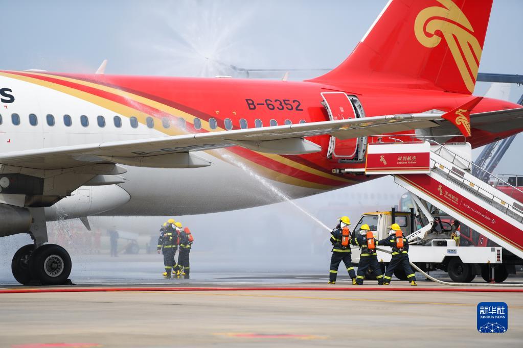 4月23日,在深圳機場舉行的演練中,航空器模擬因機械故障導致右發(fā)動機起火,消防員進行滅火。