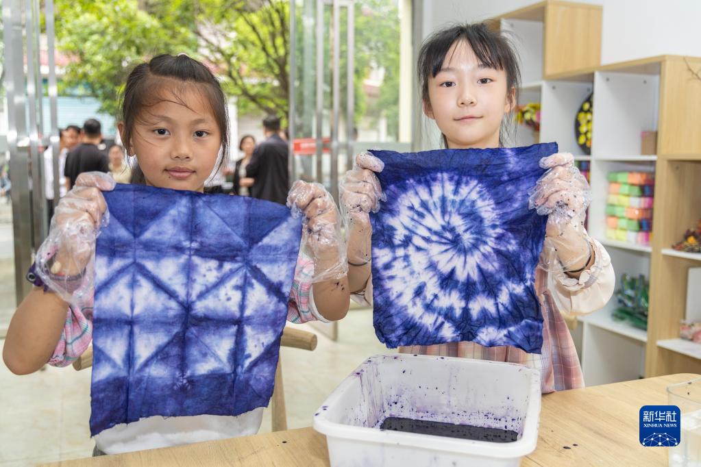 4月22日,在重慶市豐都縣名山街道,兩名小朋友展示自己的扎染作品。