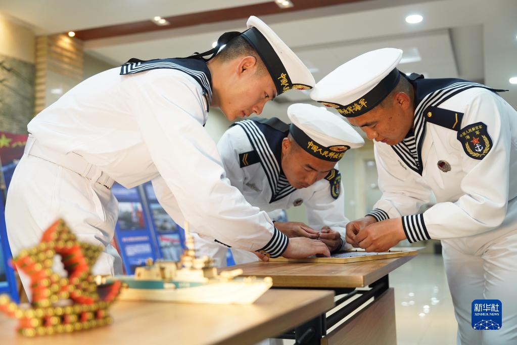 4月23日,東部戰(zhàn)區(qū)海軍某電子對抗旅官兵制作手工作品紀(jì)念人民海軍成立74周年。新華社發(fā)(高翔龍 攝)
