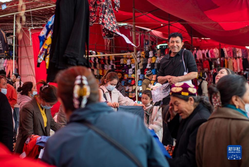 新疆莎車縣綜合巴扎上的一名服裝商販站在攤位上吆喝,吸引顧客前來購買(3月12日攝)。