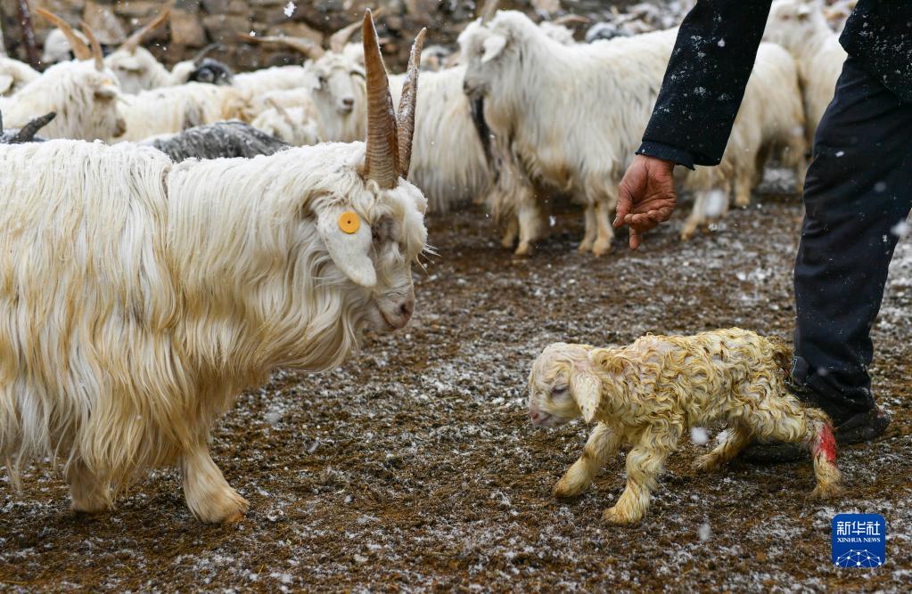 新疆塔城地區裕民縣,牧民哈布得拉什么幫助一只當天上午出生的小羊羔回到母羊身邊吃奶(4月12日攝)。