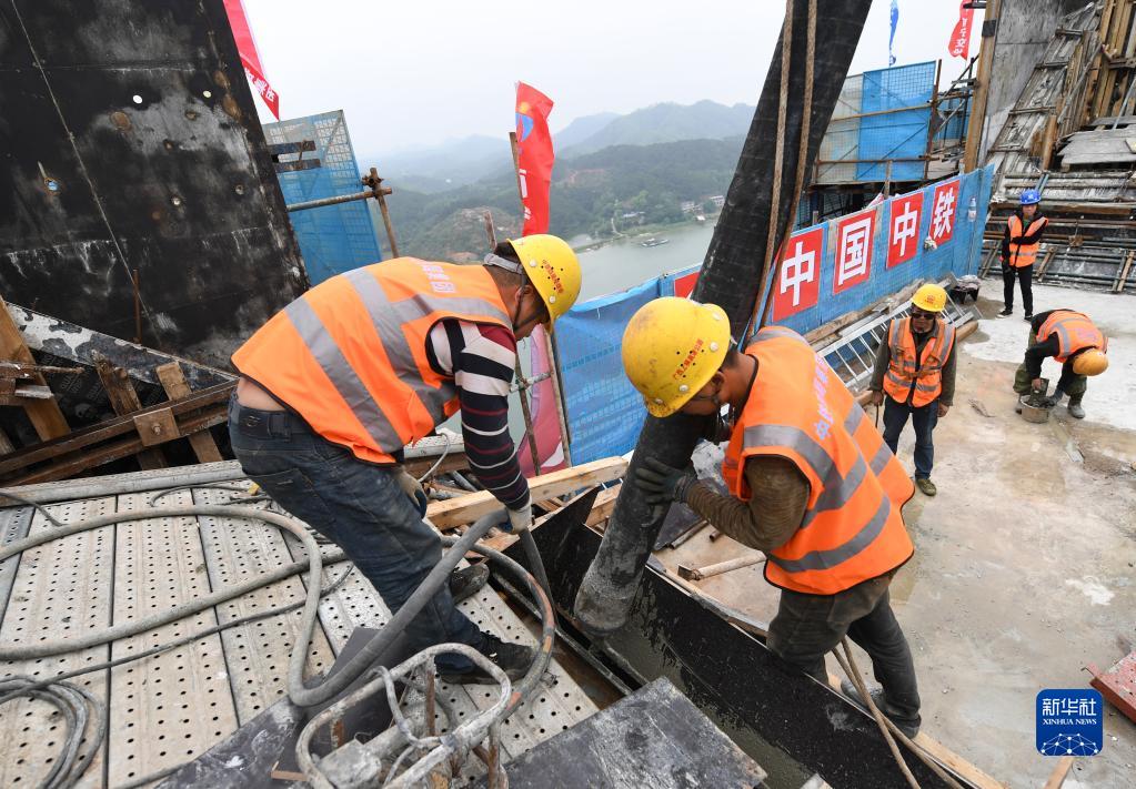 4月24日,在廣西上橫高速公路西津郁江特大橋建設現場,中鐵四局集團工人在進行主塔封頂施工。