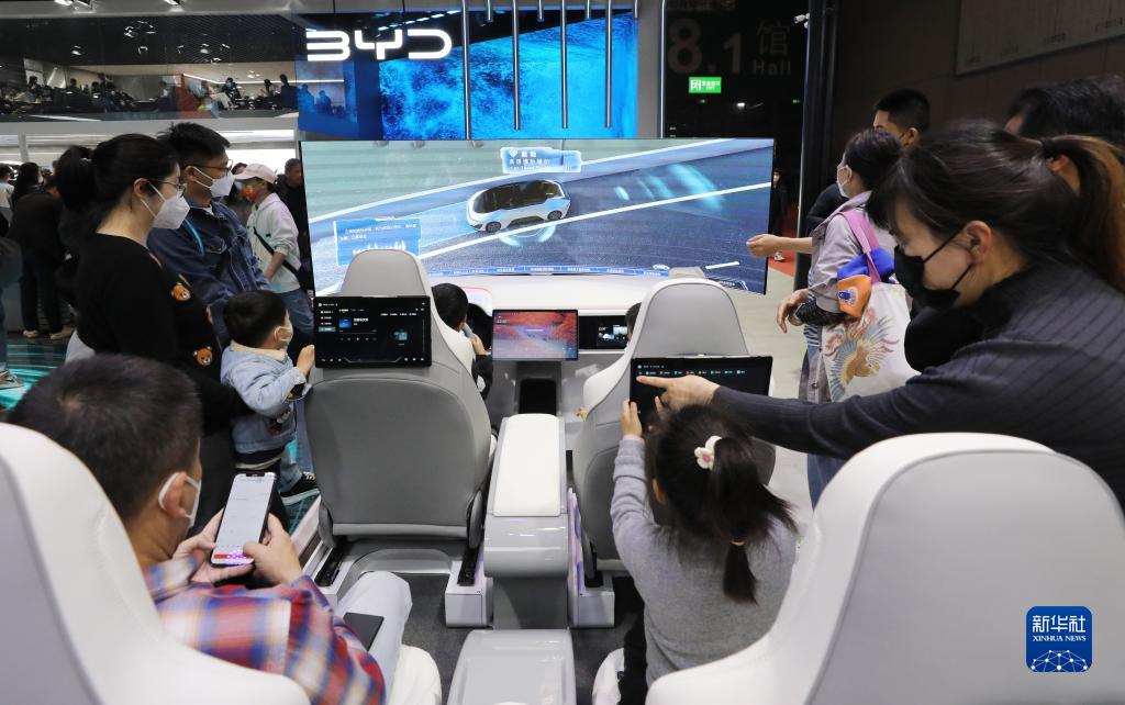 4月24日,參觀者在比亞迪汽車展臺體驗(yàn)車輛智能感知系統(tǒng)模擬器。