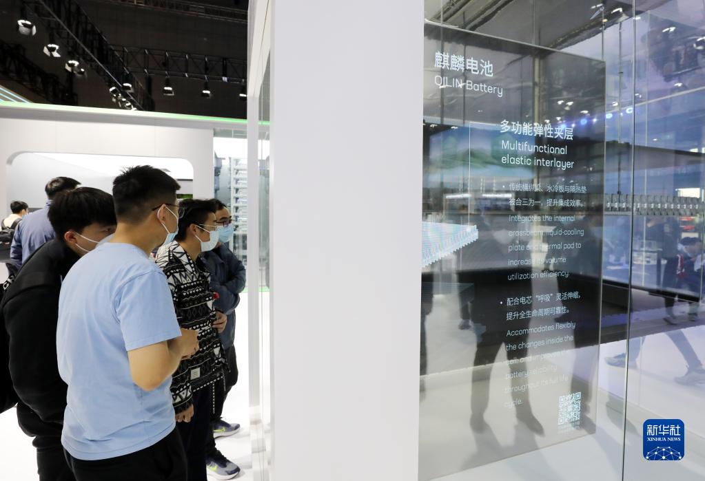 4月24日,參觀者在寧德時(shí)代麒麟電池展示模型前交流討論。
