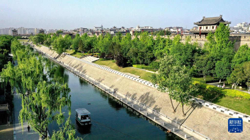 西安明城墻西側護城河(4月15日攝,無人機照片)。