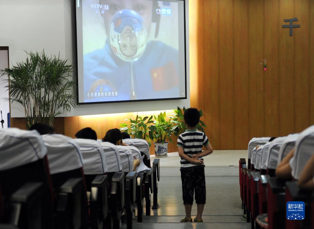 在杭州保俶塔實驗學校,小學生吳潼站在走道上觀看太空授課(資料圖片,2013年6月20日攝)。當日,航天員王亞平在聶海勝、張曉光協助下進行首次太空授課,全國6000余萬名中小學生觀看授課直播。