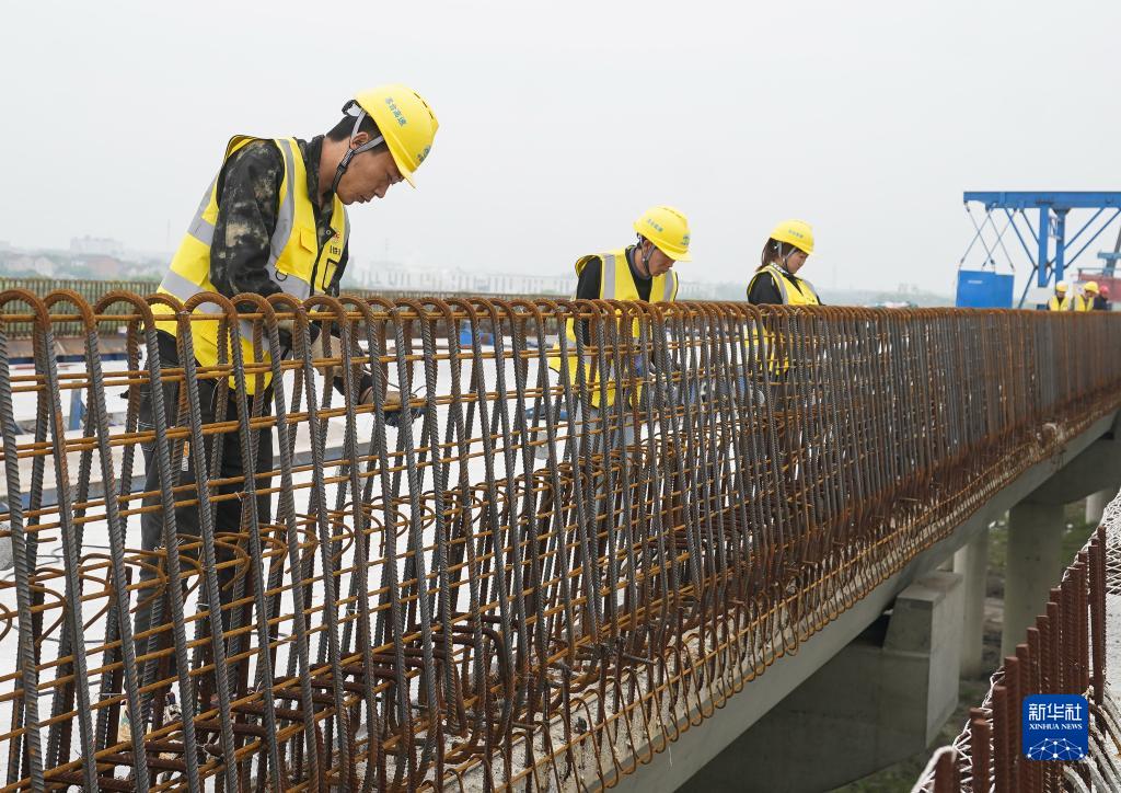 4月25日,中鐵二十局建設者在蘇臺高速公路七都至桃源段ST-QL5標施工現場綁扎鋼筋。