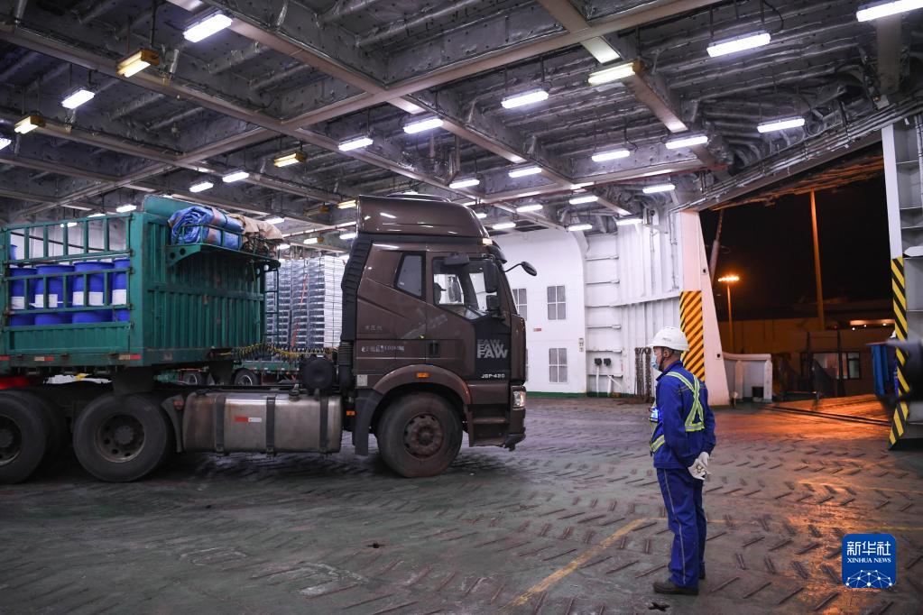 4月25日,中鐵渤海號渡船抵達大連旅順西站后,船艙內的車輛駛離渡船。