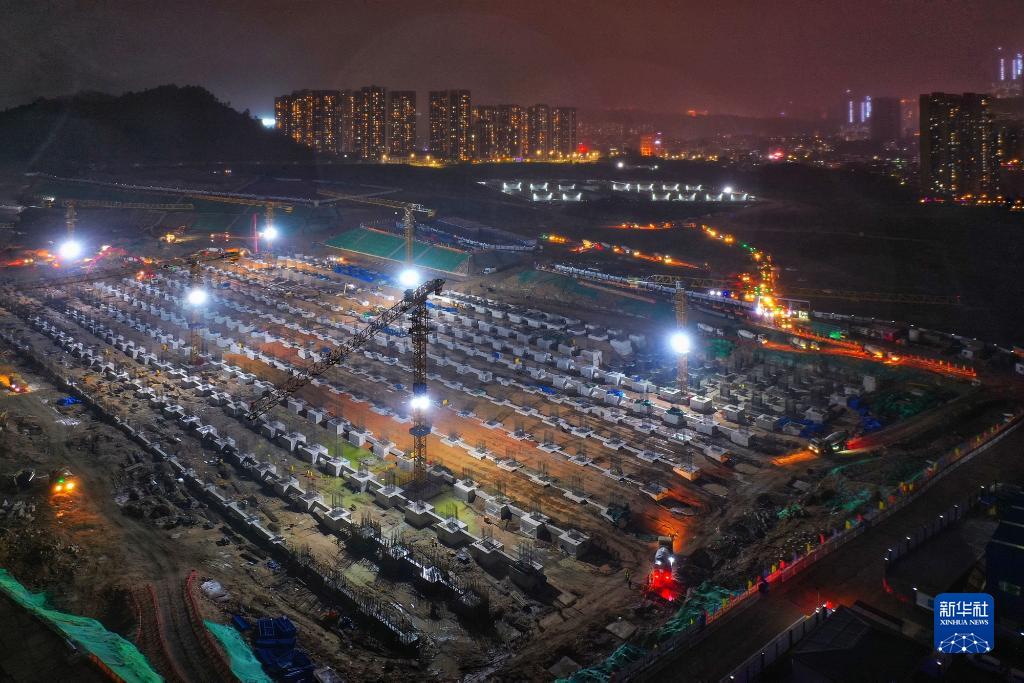 建設中的深圳地鐵5號線上水徑停車場正在進行底板獨立基礎混凝土澆筑和鋼筋籠綁扎作業(4月25日攝,無人機照片)。
