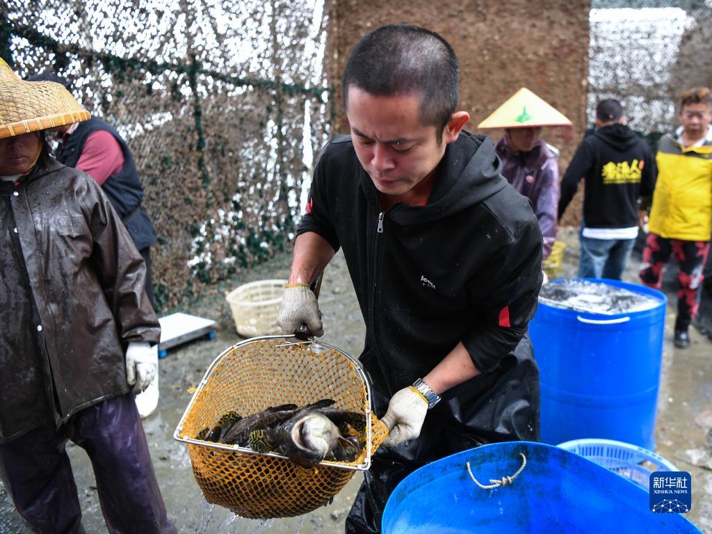 在廣東珠海萬山海域,中國首臺半潛式波浪能養殖旅游平臺“澎湖號”上,工作人員裝載剛捕撈的石斑魚(4月25日攝)。