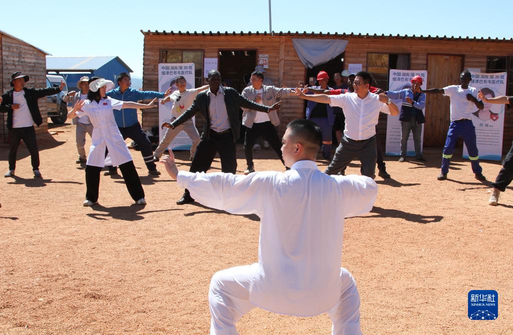 4月25日,在津巴布韋阿卡迪亞礦區,中國第20批援津巴布韋醫療隊隊員帶領中企員工和當地雇員做八段錦。